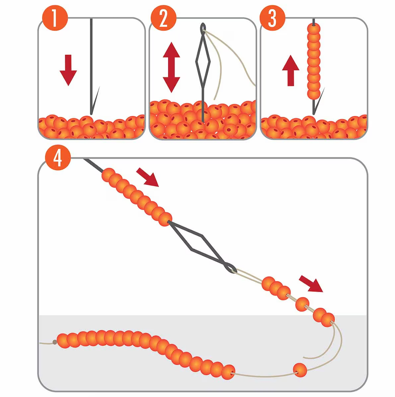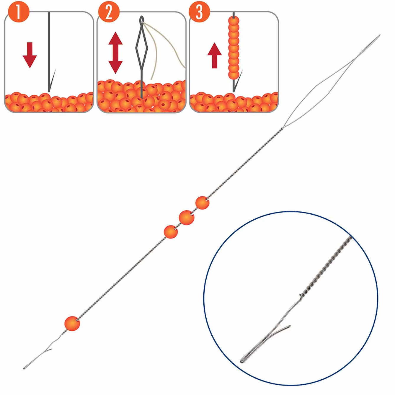 To load beads onto your thread, knot one end of the thread and pass the other through the collapsible eye of the needle, then push the barbed end in and out of the container of beads repeatedly, pausing occasionally to push the beads over the eye and down your thread.
